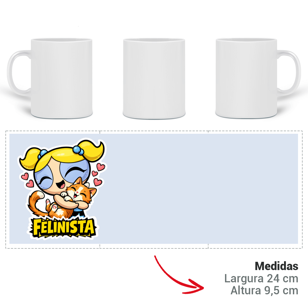 Inspirada no visual vibrante e heróico dos desenhos clássicos, a estampa Felinista é o novo uniforme de quem combate o tédio com o poder de um abraço felino. Trazendo a Lindinha em um momento de pura fofura com seu gatinho, esta caneca é para as verdadeiras heroínas do dia a dia que sabem que não existe superpoder maior do que o amor por um gato.